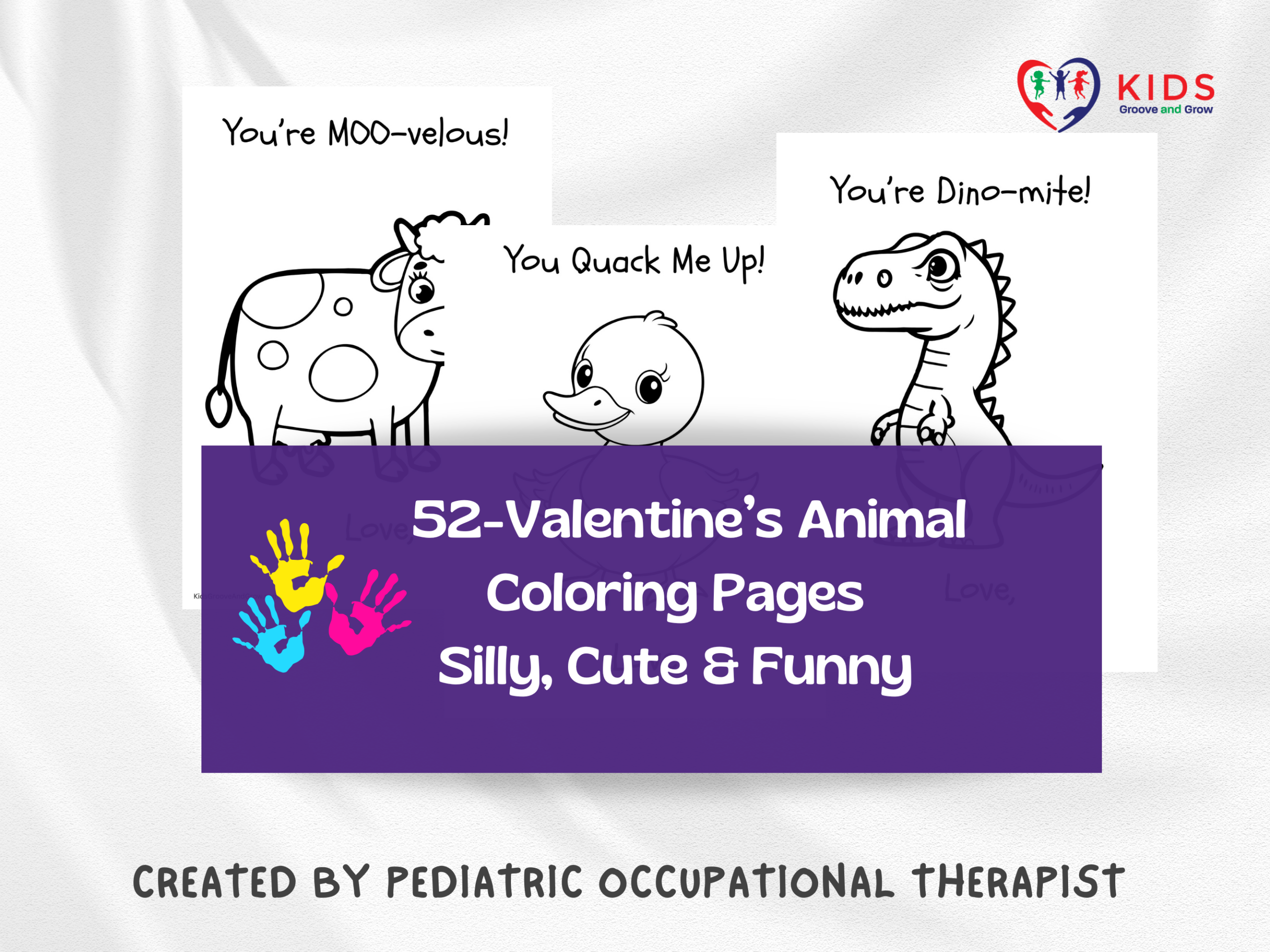 Bursting with adorable animals and sweet, pun-filled phrases, our Valentine's Day Animal Coloring Pages are sure to delight your little artists! This digital download features 52 total pages—that's 26 charming animals, each with two lovable designs—showcasing fun favorites like "Will You Bee Mine?" bees, "You're MOO-velous!" cows, "You Quack Me Up" ducks, "You're Dino-mite" dinosaurs, and more! Perfect for toddlers and preschoolers, not only will they have a blast coloring, but they'll also be building fine motor skills in the process. Download now and bring fun, laughter, and learning to your Valentine's festivities!